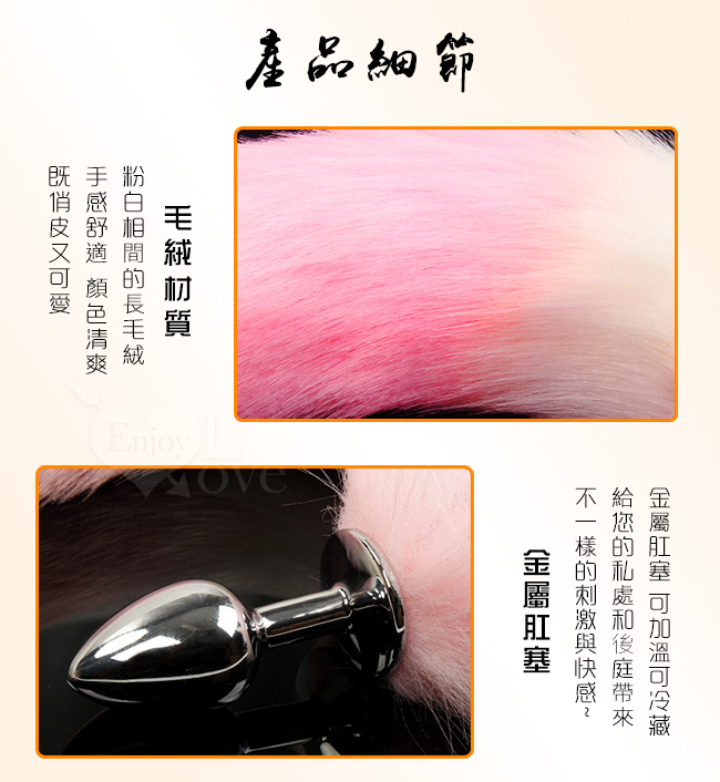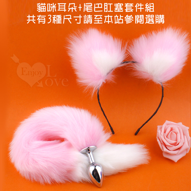 雙色粉白毛絨髮卡貓咪耳朵+尾巴肛塞角色扮演套件﹝小﹞