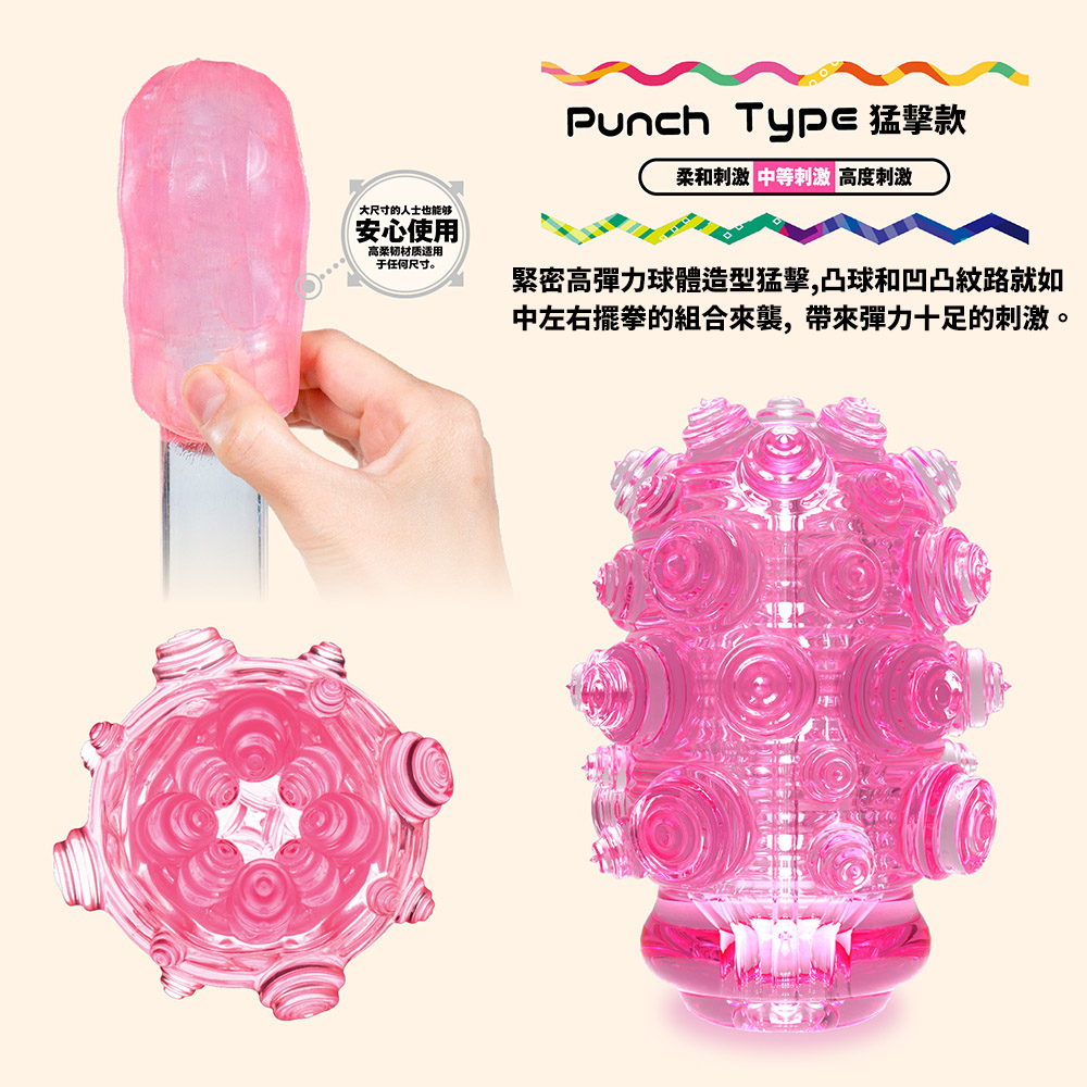 緊密高彈力球體造形猛擊,凸球和凹凸紋就如左右擺拳的組合來襲,帶來彈力十足的刺激。
