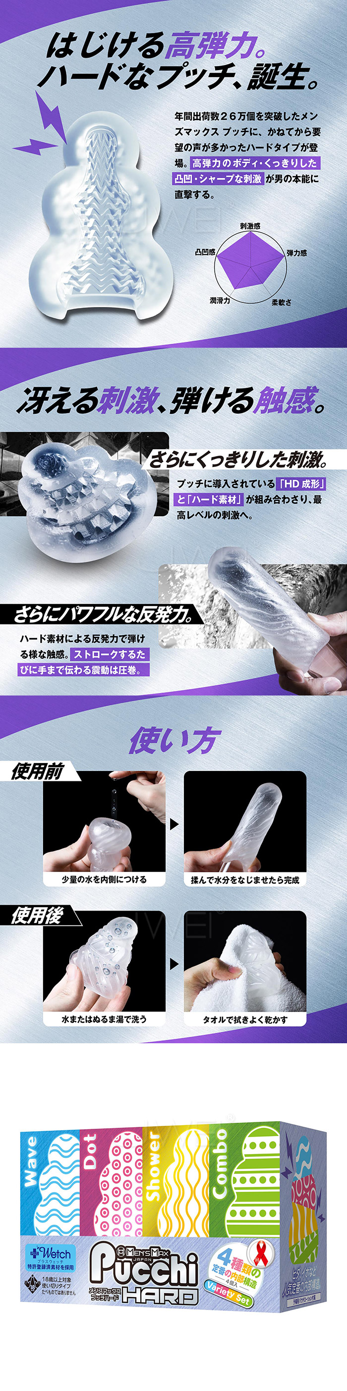 首頁>日本原裝進口MENS MAX . Set Box Variety 自慰套4入組 無需潤滑液 只需要水 即可使用