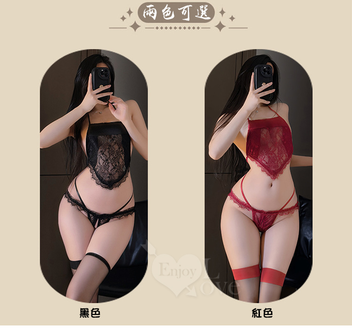 【棉花糖女孩】大尺碼絲襪連身衣!黑絲誘惑蕾絲掛脖裸背設計開襠裝