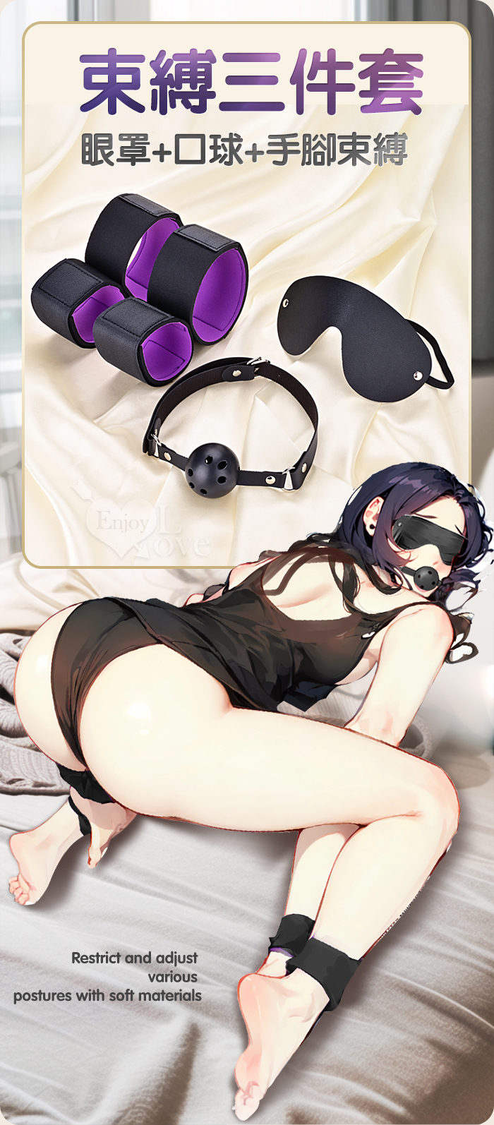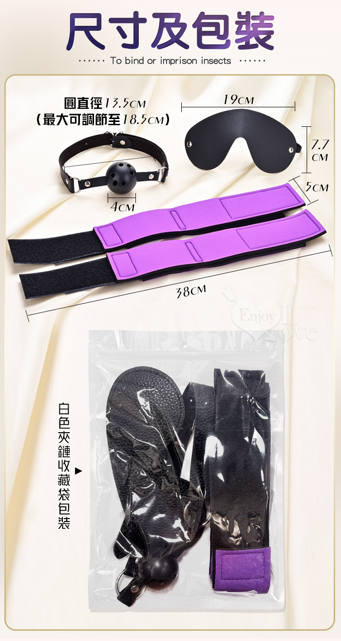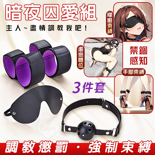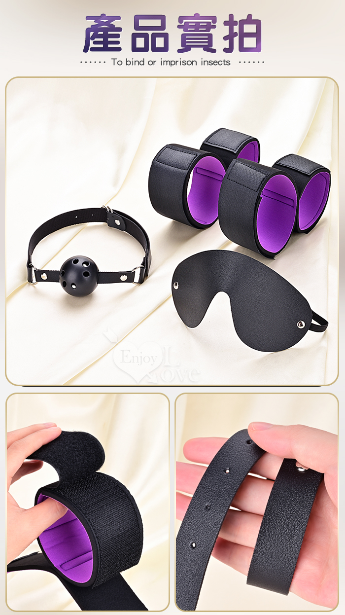►您現在的位置:首頁>暗夜囚愛組 ‧ 皮革眼罩+失語口塞+手腳束缚銬 禁錮感知三件套 SM