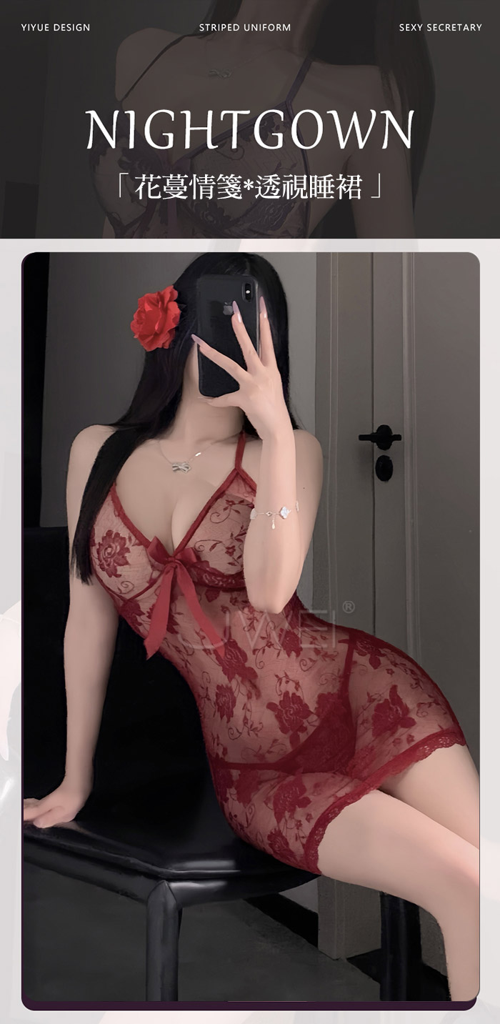 首頁>枕邊禁語.純欲花蔓薄紗透視睡裙-棗紅色【睡裙+T褲】