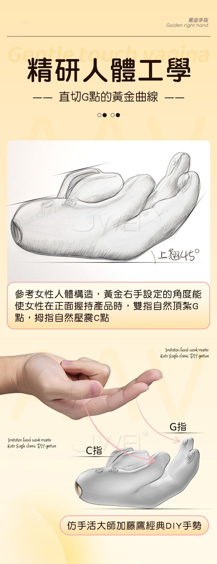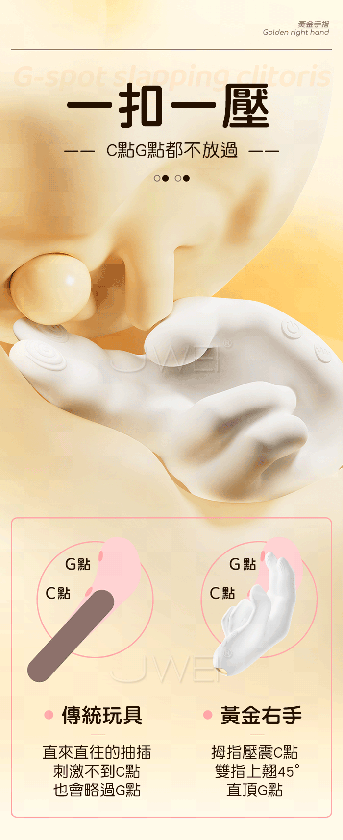 黃金右手指間神技,每一次觸碰都是神奇,精研人體工學,直切G點的黃金曲線 一扣一壓,100種玩法~拇指壓震C點,雙指上翹45度直頂攪動G點,一個都不放過! 智能加溫科技,漸漸升温每一刻都被關愛。 產品規格 ■材質: ABS+矽膠 ■規格: 詳如圖片標示 ■特色: 10頻摳動、10頻震動、加溫