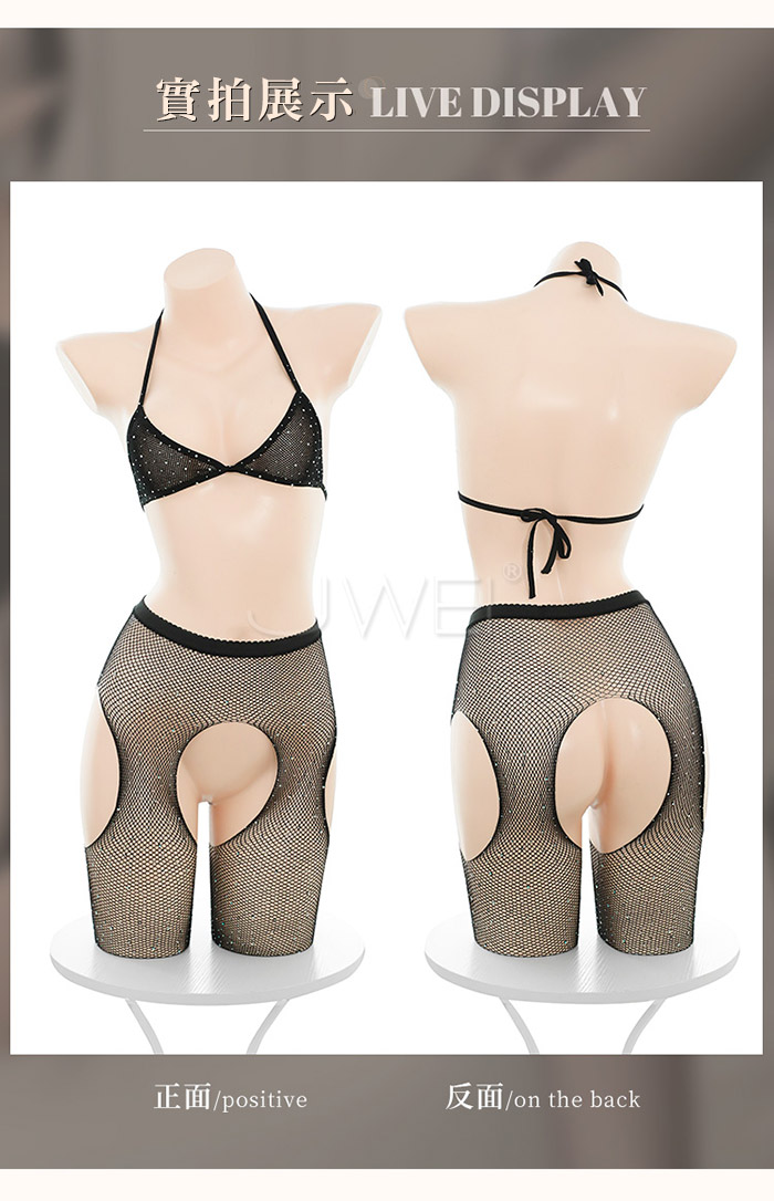 ►您現在的位置:首頁>暗夜星芒.閃鑽露膚分離式開襠網襪套裝【繫帶胸罩+開襠連褲襪】