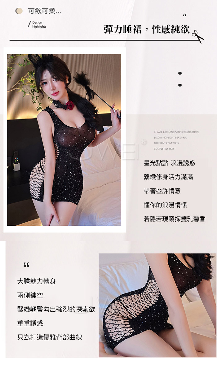 ►您現在的位置:首頁>耀眼甜心.甜美公主風朦朧鏤空透視包臀網衣