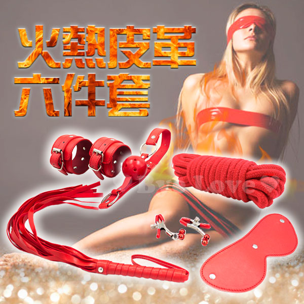 滿3000元贈品 SM 火熱皮革情趣7件套-紅/黑色(眼罩+手銬+皮鞭+棉繩+口塞+乳夾+脖圍)