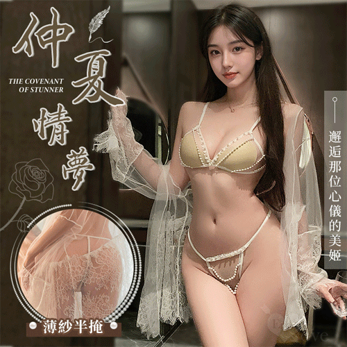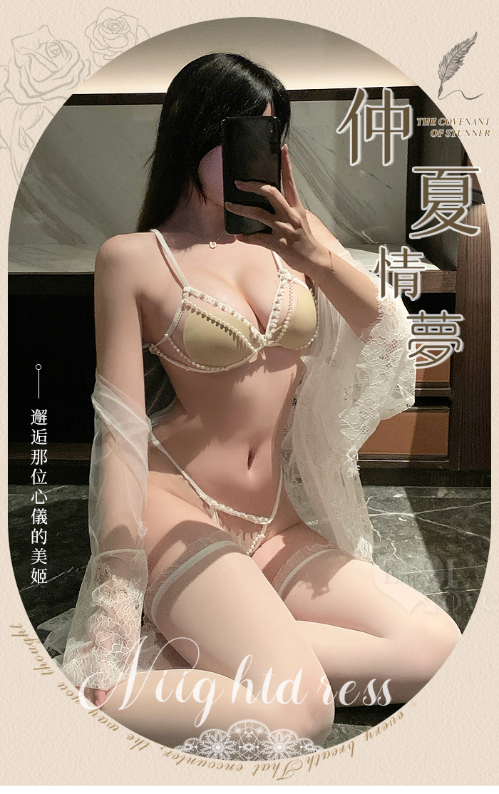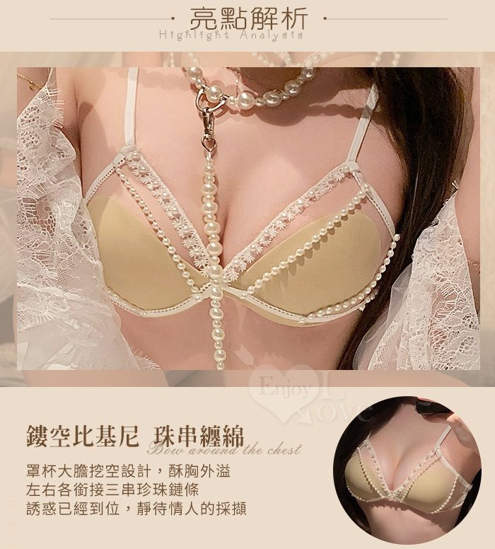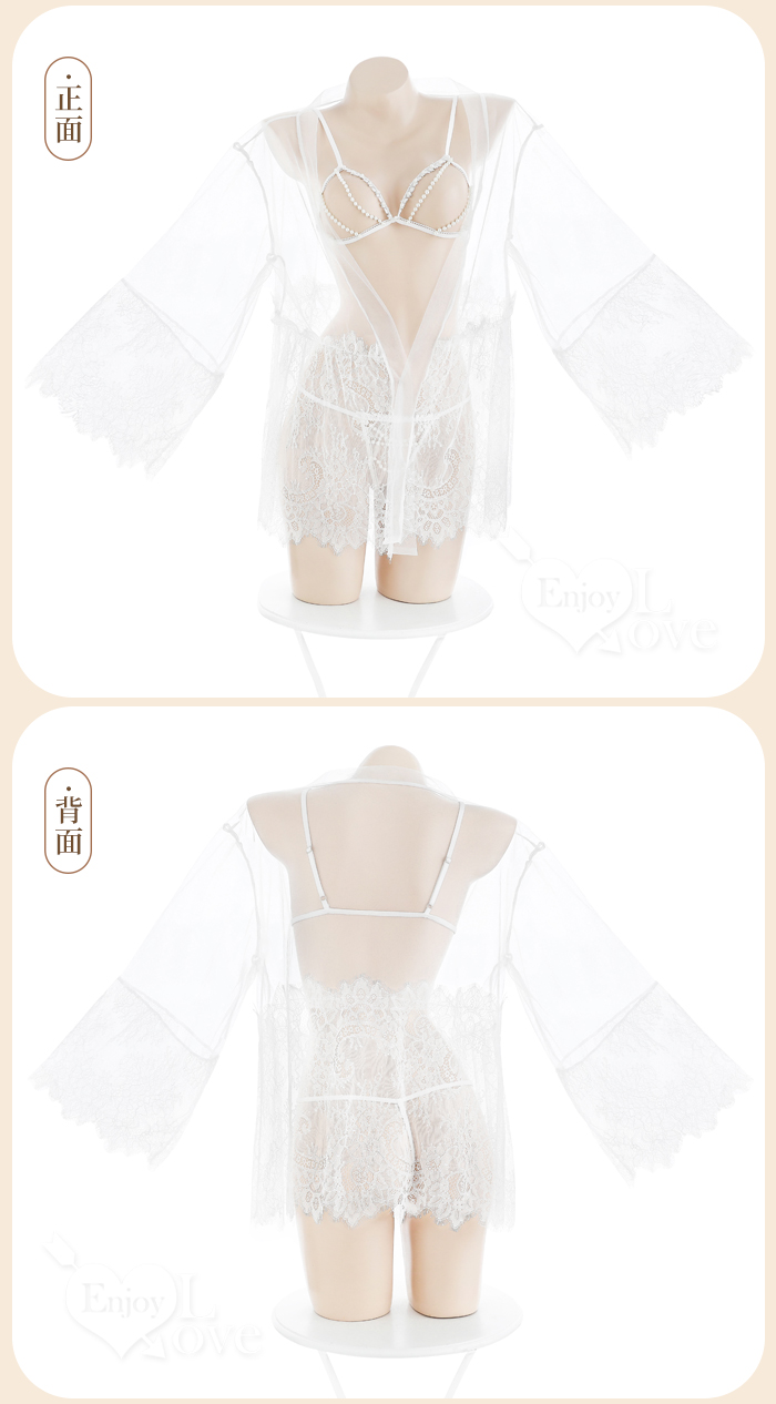 鏤空珠串蕾絲情趣套裝|透紗罩衫+珠鏈比基尼+丁字褲三件組
