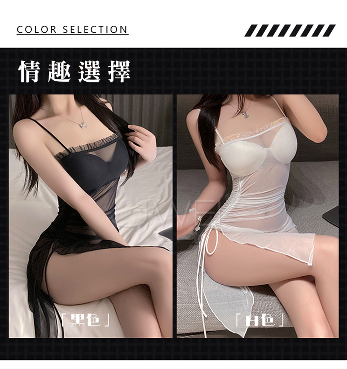 ►您現在的位置:首頁>夜紗迷境.韻味透紗木耳邊飾側開衩抽褶收腰睡裙【睡裙+T褲-白色】