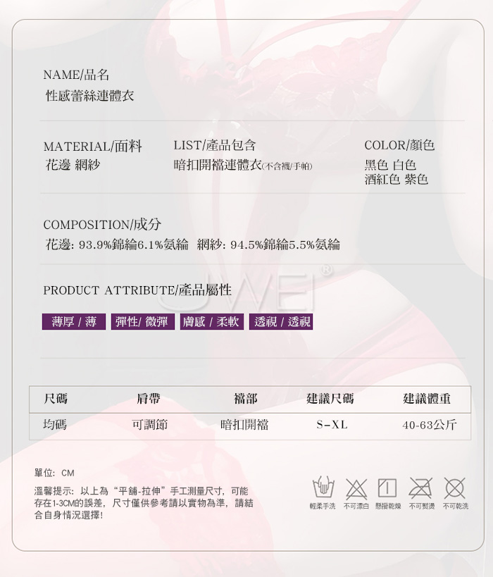 ►您現在的位置:首頁>夜闌私語.深V露溝花蔓蕾絲修身暗釦開襠連體衣【黑色】