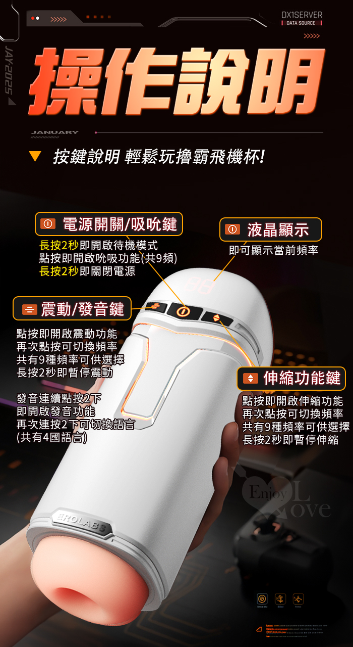 EROLABS 擼霸全配版 ‧ 智能伸縮/吸吮/震動/語音 緊實肉感自慰鍛練杯﹝液晶數碼9頻伸縮X9頻吸吮X9強震+4國淫聲+耳機﹞黑色