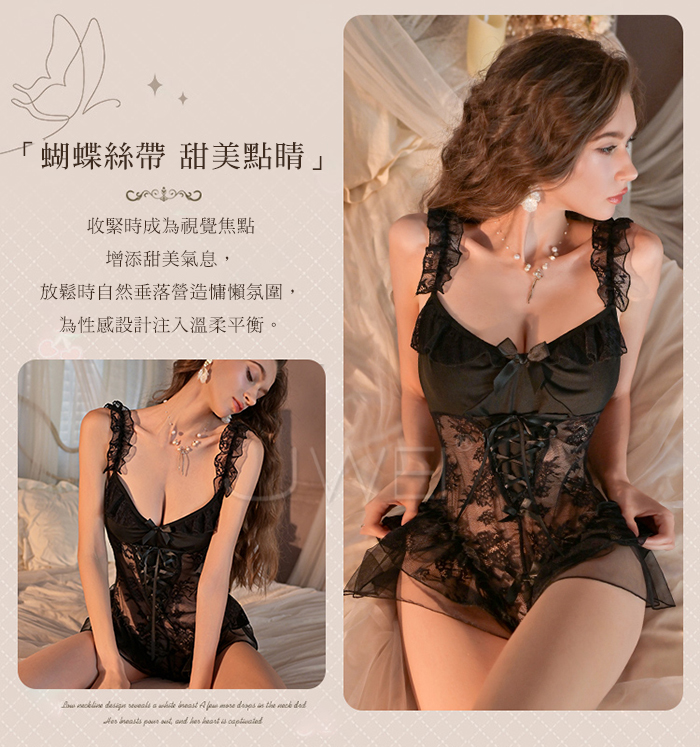 慾情薔薇.蕾絲深V美肩露背花蔓透紗開襠連體衣【黑色】